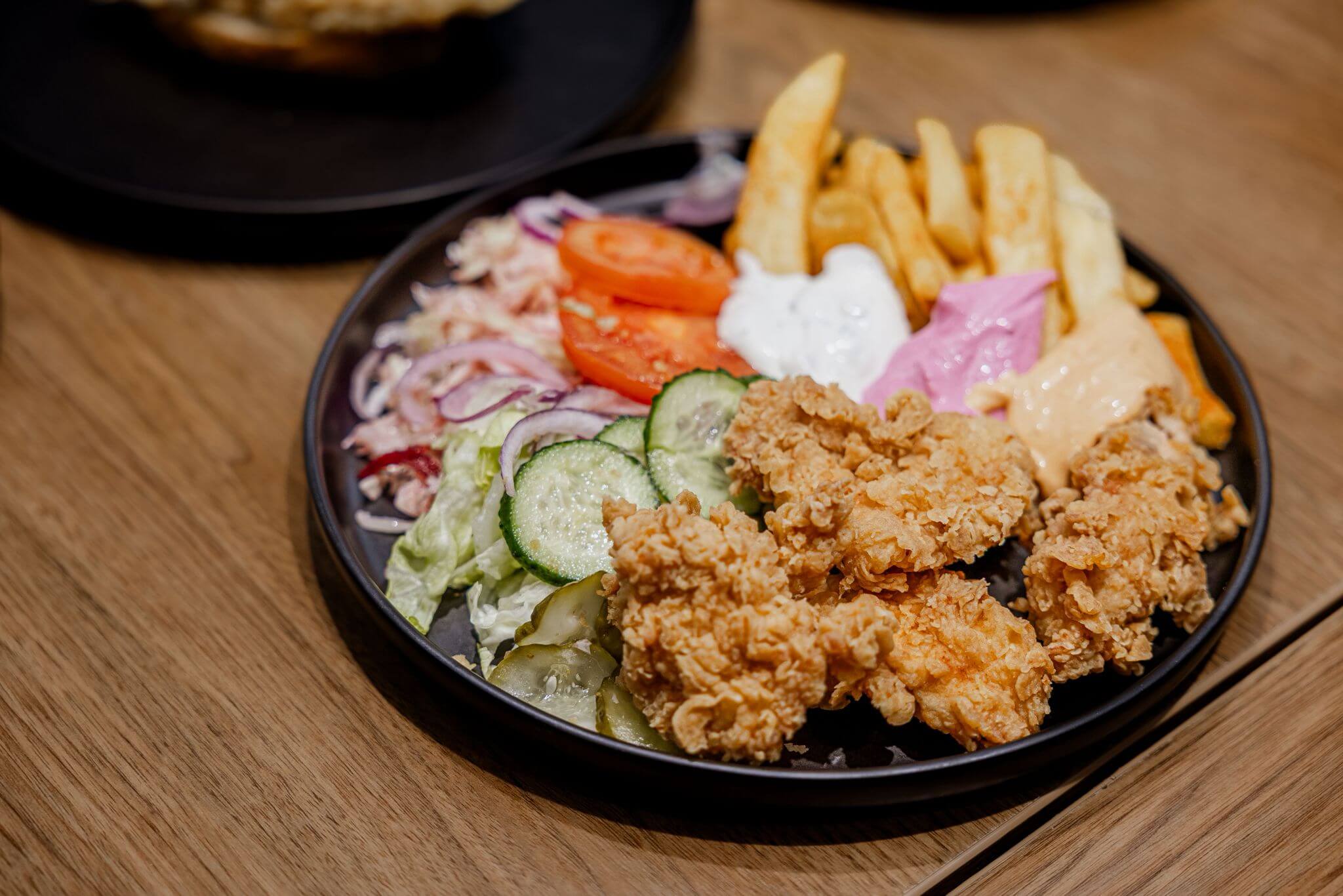 Aripioare picante crispy 4 bucati , cartofi prajiti, salata de varza, salata verde, rosii, castraveti proaspeti, castraveti murati, ceapa, lipie coapta pe vatra, sosuri la alegere – 500g